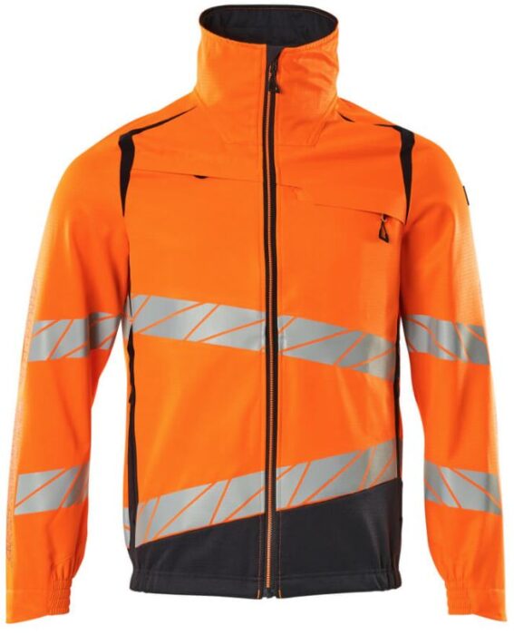 Fluorescent with oblique, transverse reflective strips. Stretch fabric on parts of the product. Combination of the lightweight fabric and Ultimate Stretch fabric. Two-toned. High collar. Fastening with zip and internal storm flap. D-ring. Chest pocket with a zip. Front pockets with a zip. Inner pockets. Elastic at the sides and waist. Elastic at cuffs.