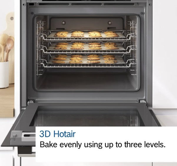 Achieve perfect baking and roasting results with the Bosch Serie 2 Built-In Oven, designed to deliver even heat distribution and intuitive functionality. With its spacious 66-litre cavity, 3D Hotair technology, and four versatile cooking functions, this oven offers exceptional performance and ease of use—whether you're preparing weeknight meals or entertaining guests.