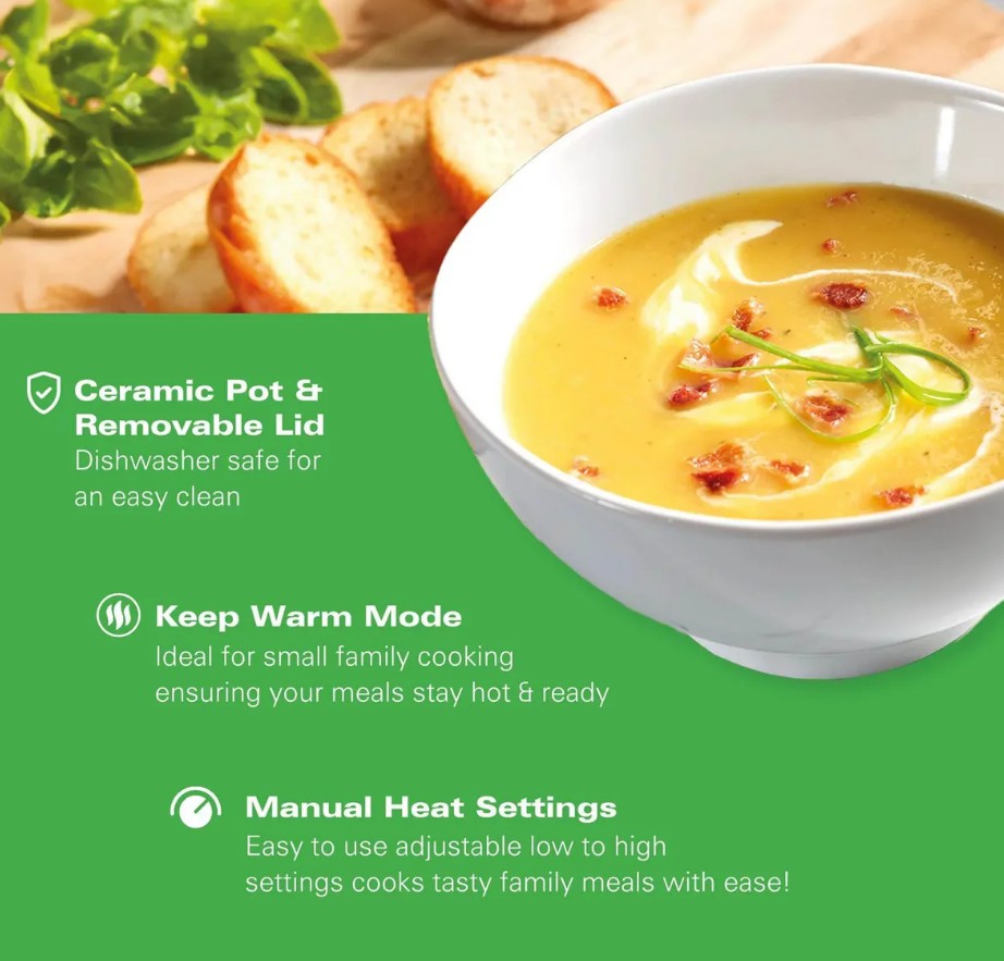 Its compact size makes it ideal for couples or smaller households, yet the 3.5-litre capacity is still large enough to serve up to four portions. From casseroles and curries to soups, roasts and even desserts, this versatile cooker handles everyday meals with ease.