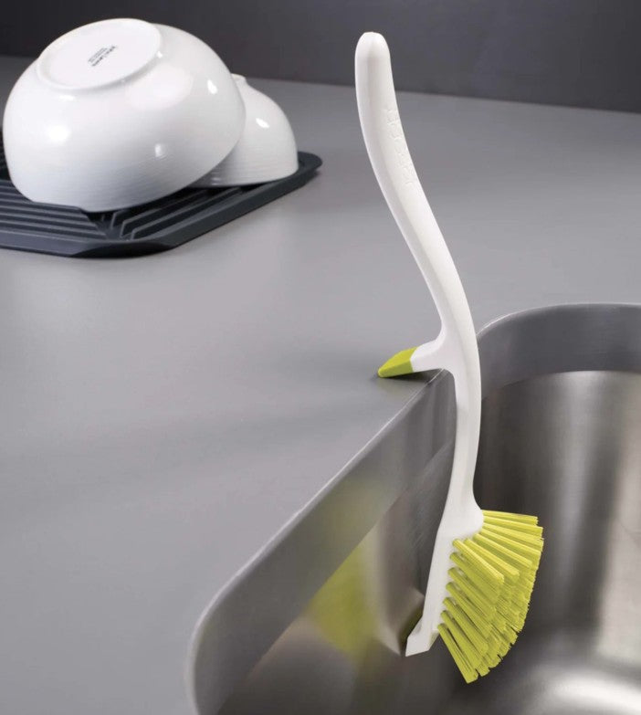 The Joseph Joseph Edge™ Washing Up Brush is a smart sink-side solution designed for cleaner, more efficient dishwashing. With a non-slip resting point, it perches neatly on the edge of your sink, allowing excess water and soap to drain away—keeping your countertop tidy and the brush dry between uses.