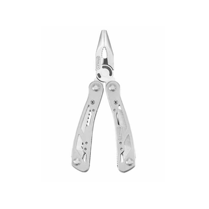 Ideal for everyday uses at work or at home. Supplied with a STANLEY branded pouch with a belt clip. Modern, sleek polished look. Hardened and tempered tools for long life.Universal Pliers with Serrated Noses, Wire Cutter, Saw, Small & Large Knife, Bottle Opener, Curve Jaw Pliers, 3,6 & 8mm Flared Screwdrivers, Phillips 1 Screwdriver & a Stanley Pouch.